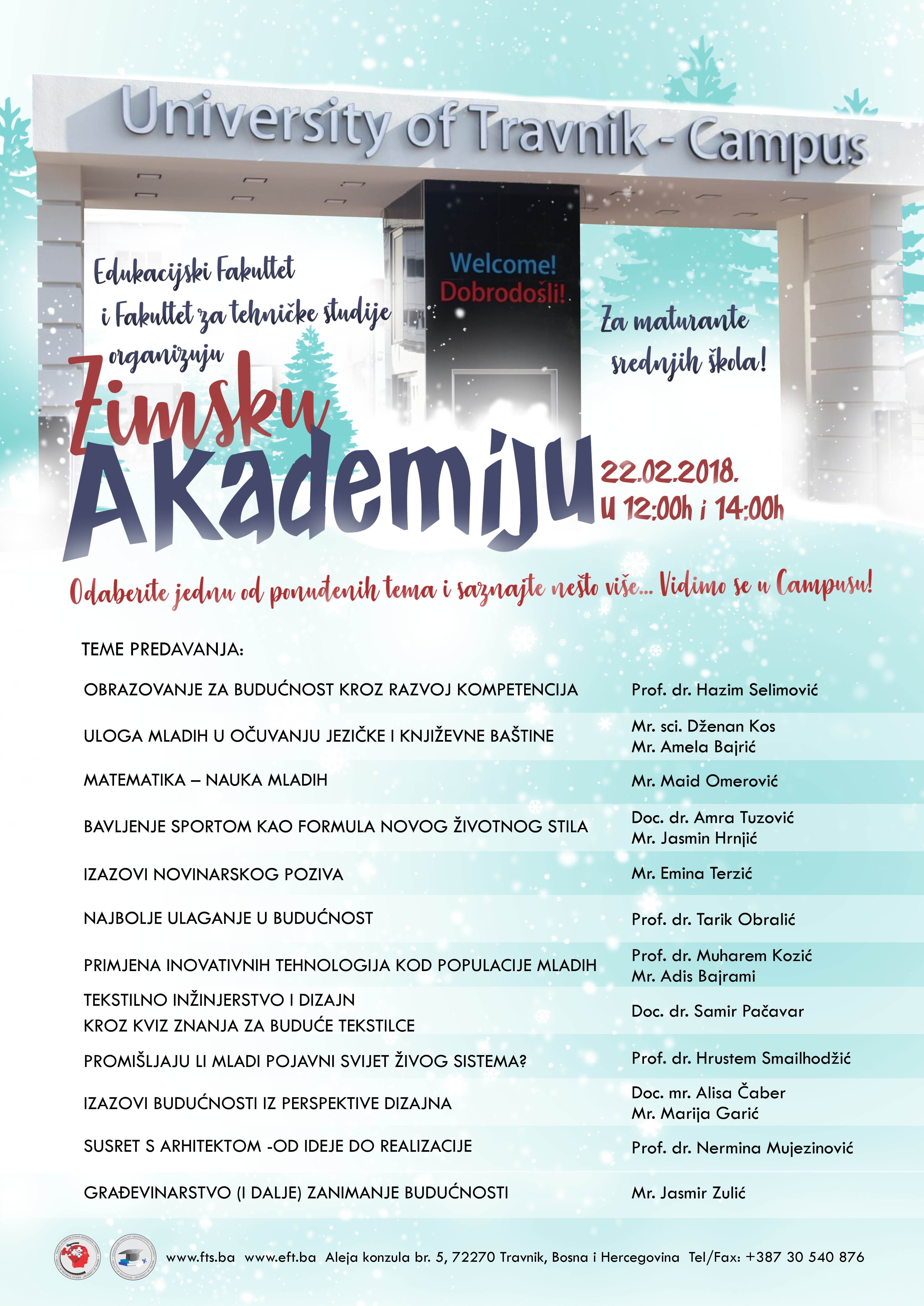Otvaranje Zimske akademije planirano je za 22.02.2018. godine od 12:00 sati – konferencijska sala fakulteta – za srednje škole s područja općine Travnik – prva smjena, odnosno od 14:00 sati za srednje škole s područja općine Travnik – druga smjena.