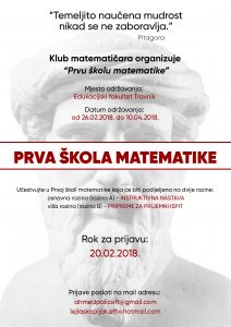 Prijave za učešće u Prvoj školi matematike svakodnevno pristižu. Poziv je poslan svim srednjim školama na području Općine Travnik, te u vezi s tim prijave i dolaze iz navedenih škola. Evidentirana je velika zainteresiranost za navedeno, jer je prepoznato da će se matematika izučavati na zanimljiv način, kako bi se navedena nauka popularizirala u društvu, i to ne samo kod učenika naprednih grupa, nego i kod onih koji bi možda željeli naučiti nešto novo, kako bi razvijali sposobnost logičkog mišljenja, samostalnog učenja, ali i timskog rada pri rješavanju složenijih matematičkih zadataka. Rok za prijave jeste 20.02.2018.godine.