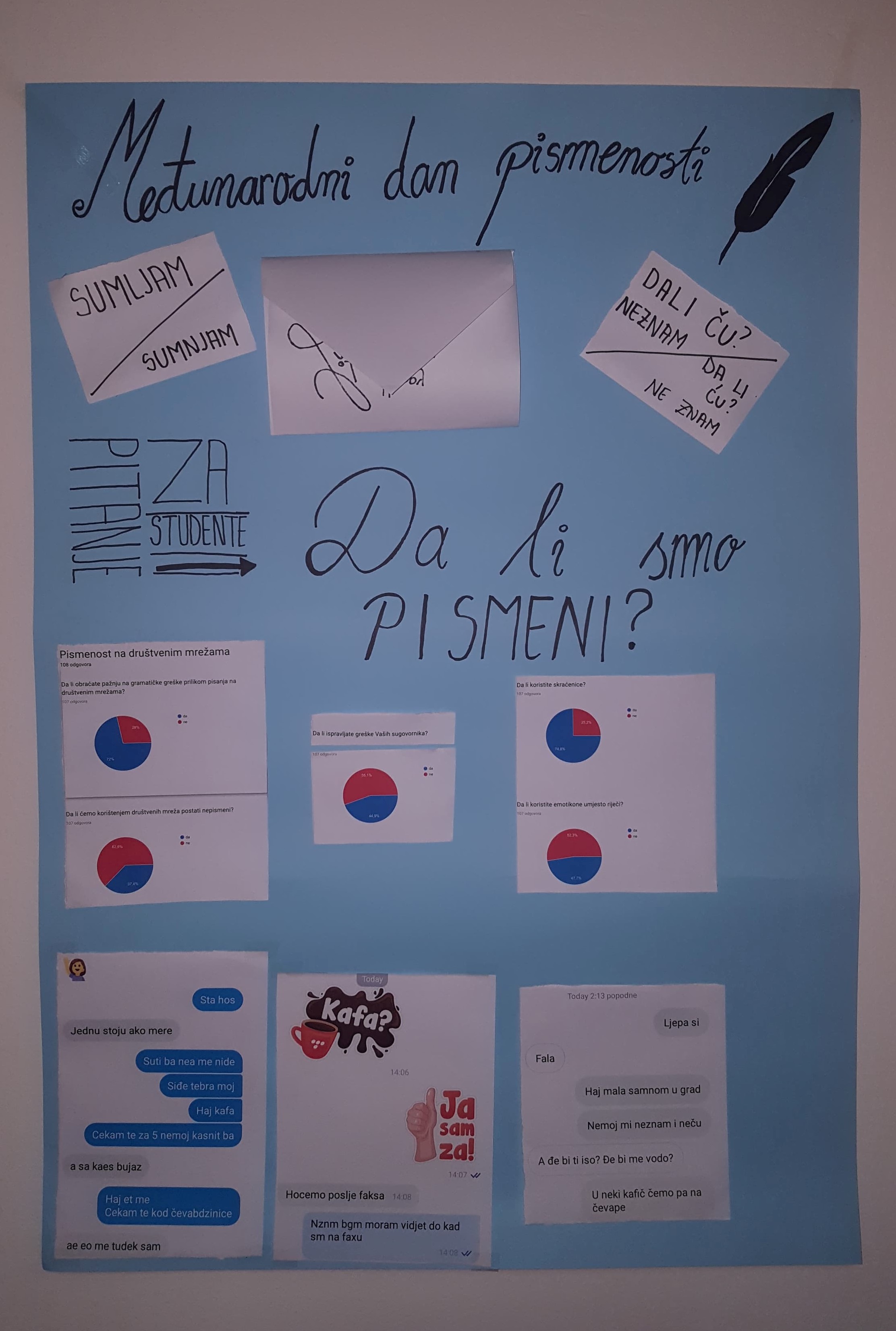 Povodom svjetskog dana pismenosti članovi PR tima studenata EFT i FTS, željeli su skrenuti pažnju na način pisanja putem društvenih mreža. Mladi sve manje pišu gramatički ispravno, koriste skraćenice i emotikone. Tim povodom napravljeno je istraživanje kojim je obuhvaćeno 107 ispitanika sa područja općine Travnik, starosne dobi od 14 do 25 godina. Pitanja su se odnosila na uticaj društvenih mreža na pismenost.