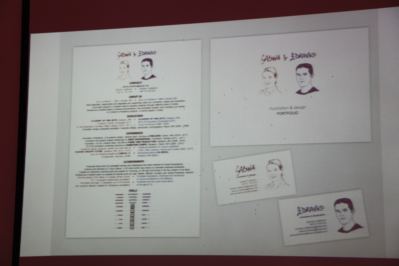 Sabina i Zdravko Cvjetković, eminentni stručnjaci na polju dizajna održali su predavanje u sklopu naše studentske konferencije. Obrađena je aktuelna tema „Publicitet – dizajn i animacija“. Naime, današnji susret obilježilo je vrlo interesantno izlaganje dosadašnjih projekata i ilustracija koje oslikavaju različite tematske okvire. Osim toga, imali smo priliku da se upoznamo sa njihovim životnim putevima prepunim dobrih rezultata u oblasti animacije i digitalnog dizajna koji je ipak posljedica velikog truda i zalaganja.