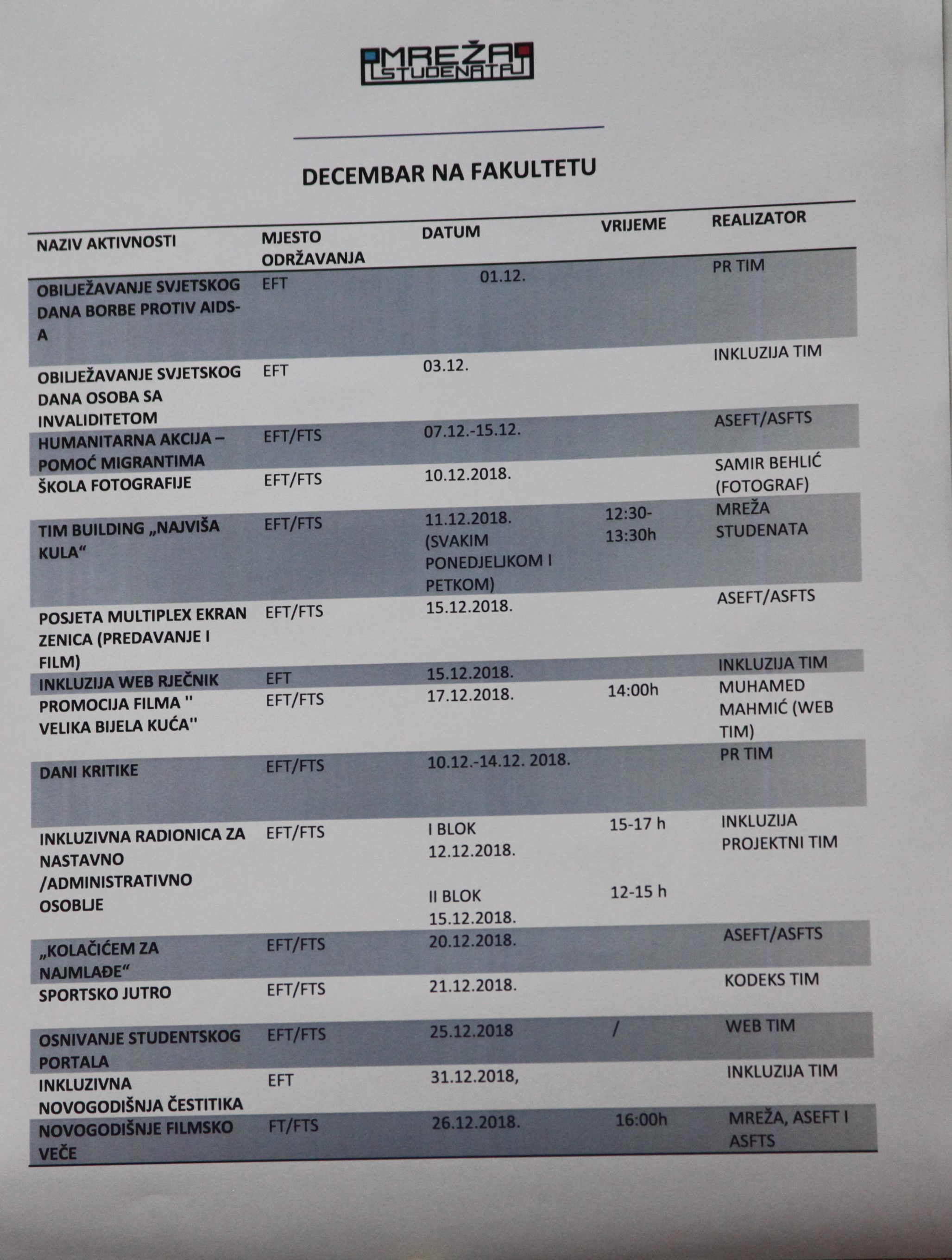 Nakon uspješno realizirane Prve studentske konferencije GeTID-S 2018, Mreža Studenata nastavlja sa aktivnostima u okviru plana “Decembar na fakultetu“.