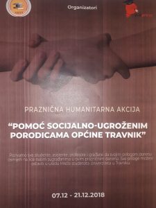 Ovogodišnja humanitarna akcija „Pomoć socijalno ugroženim porodicama općine Travnik“, je organizirana povodom predstojećih božićnih i novogodišnjih praznika. Podsjetimo, akcija je počela 7. decembra i traje do 21. decembra 2018. godine. U pomenutom periodu donacije možete donijeti u ured Mreže studenata Univerziteta u Travniku.