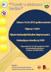 Asocijacija studenata Edukacijskog fakulteta u okviru manifestacije „Dani općine Travnik 2019“ organizuje turnir u stonom tenisu za studente i učenike srednjih škola. Cilj ove aktivnosti jeste podizanje svijesti kod mladih o važnosti bavljenja sportom i sportskim aktivnostima, bilo da je to profesionalno ili rekreativno.