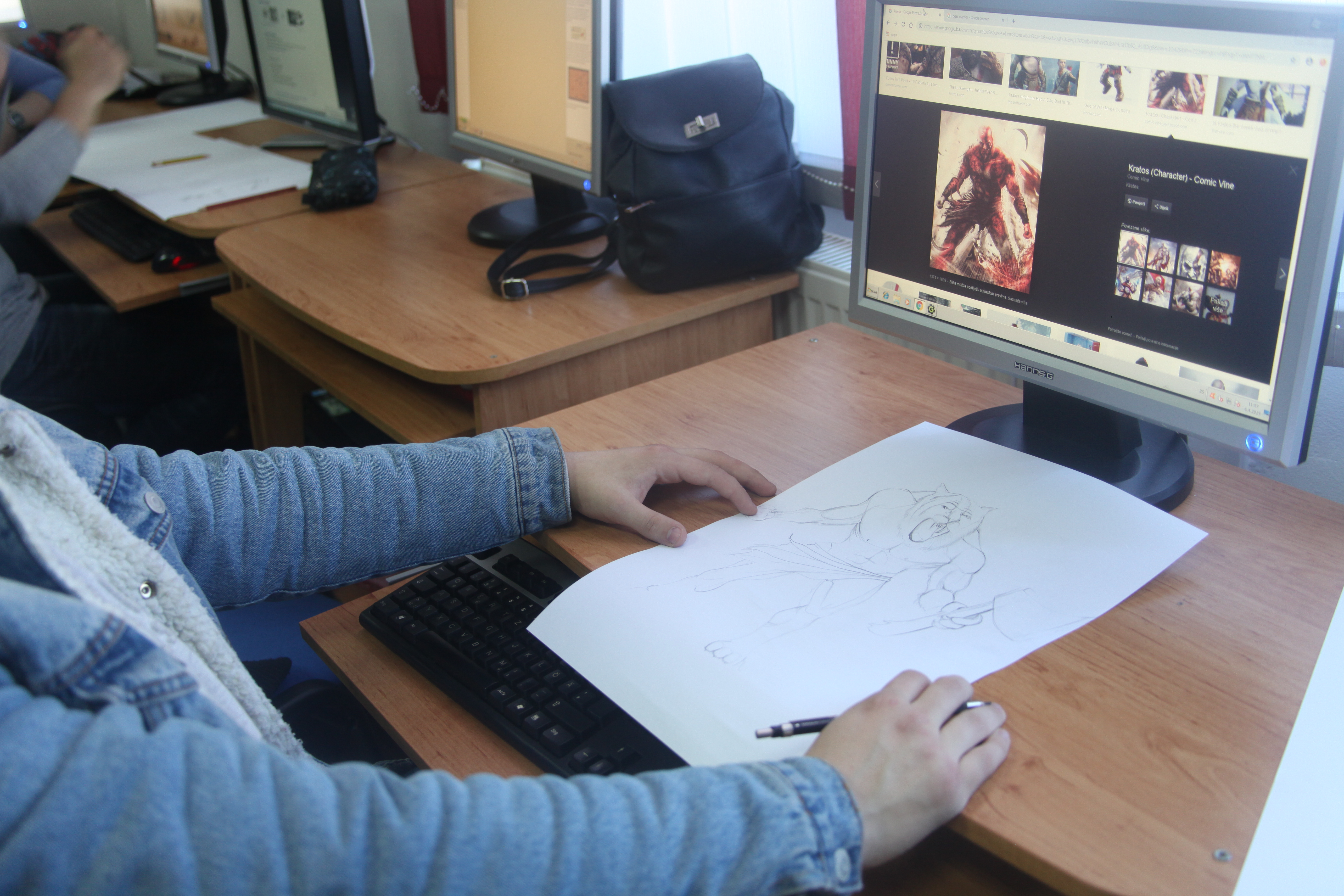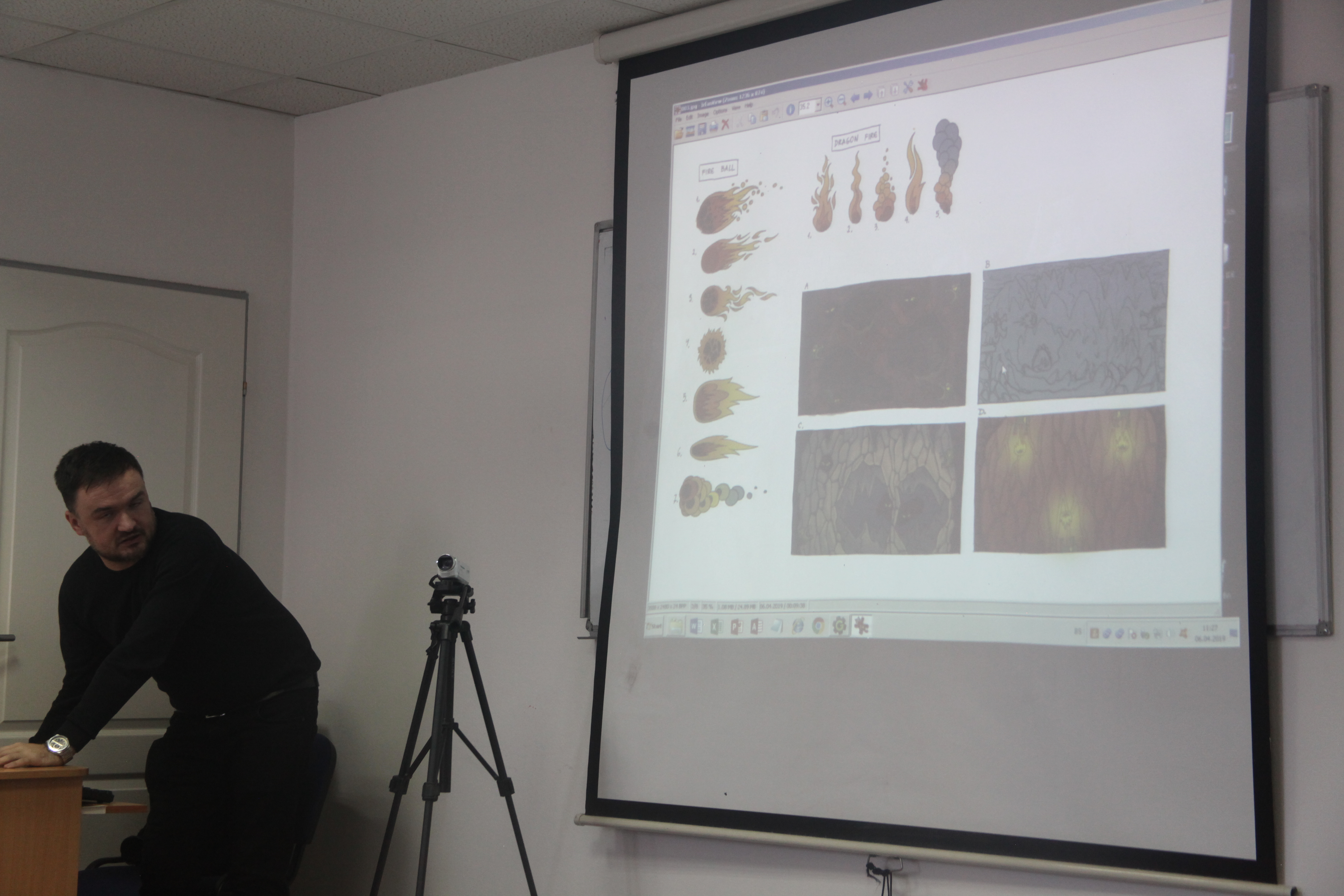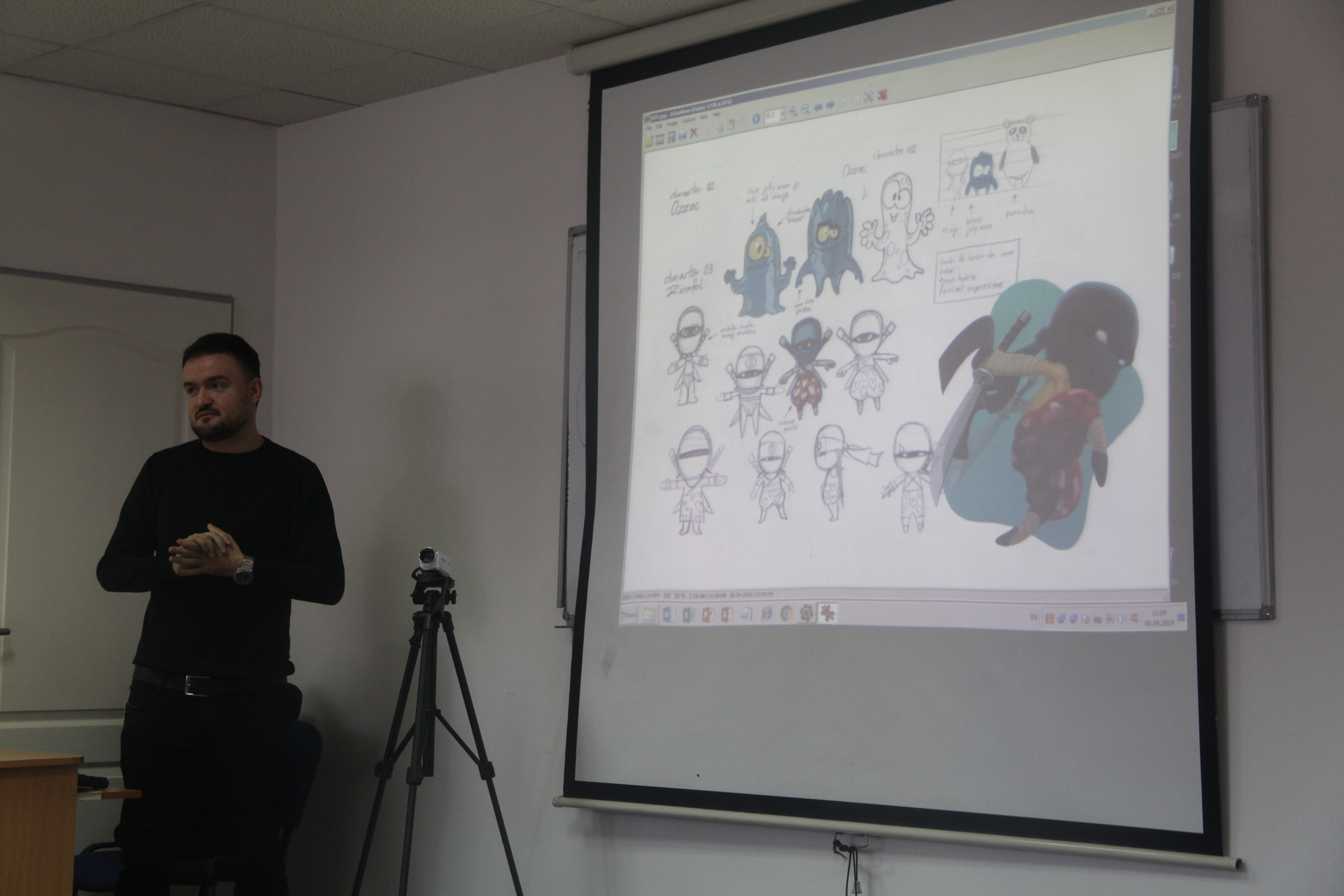 U prvom dijelu prezentirani su primjeri iz dosadašnjeg rada predavača kako bi se učesnicima približilo samo stvaranje lika i pozadine u photoshopu. Kao što je i samo osmišljavanje igre timski zadatak, jednoglasno je dogovorena tematika, te su učesnici dobili  interesantan zadatak. Naime trebali su osmisliti lika kojeg će prvo nacrtati na papiru sa svim dijelovima, a zatim prenijeti u photoshop.