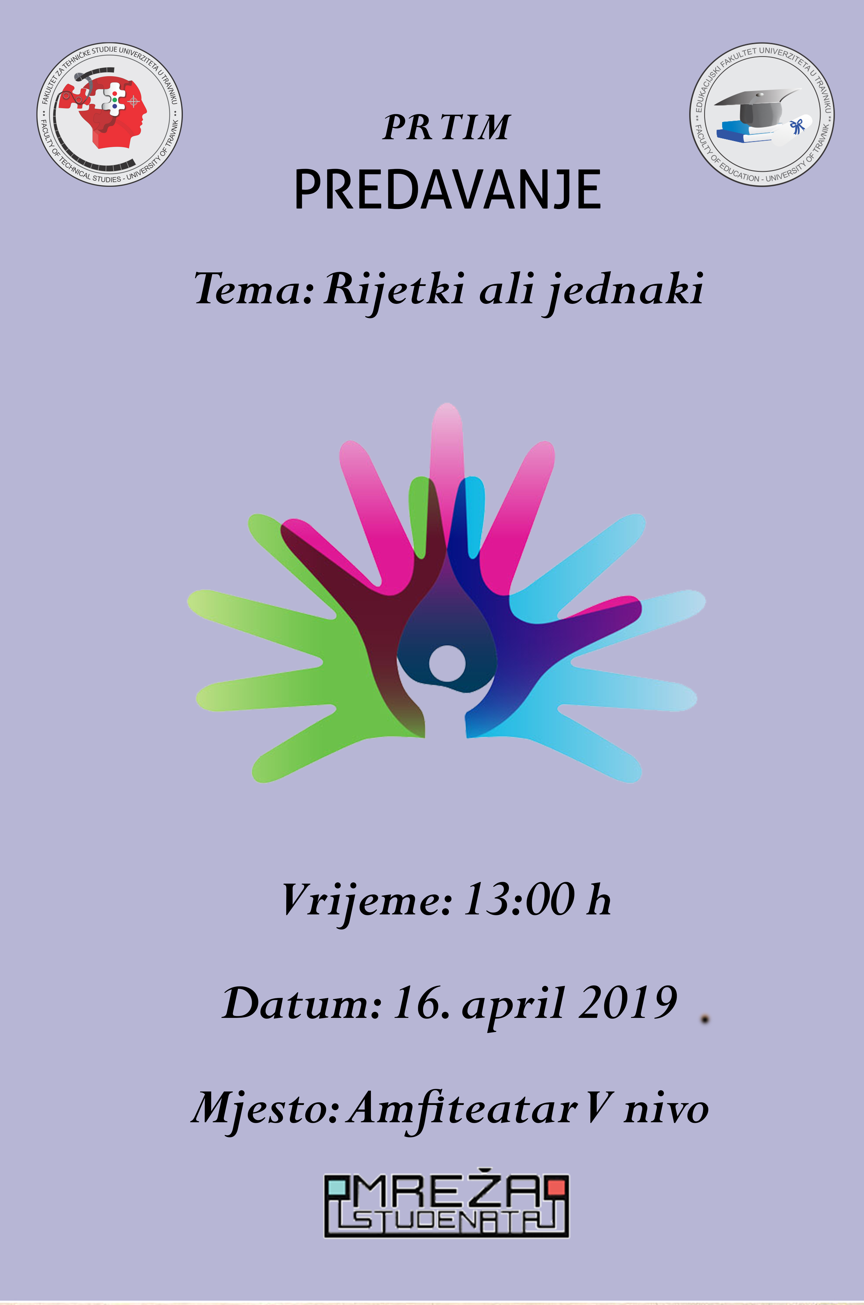 Svjesnost o ovoj bolesti je vrlo mala, stoga sa zadovoljstvom najavljujemo predavanje pod nazivom “Rijetki, ali jednaki” koje će se održati 16. 4. 2019. godine u 13:00 sati na Edukacijskom fakultetu u amfiteatru na V nivou. Predavanje posvećeno fenilketonuriji će održati naša studentica Ivana Zec, koja boluje od iste. Ova aktivnost ima za cilj podizanje svijesti o ovoj bolesti, ali i prihvatanje osoba sa fenilketonurijom kao ravnopravnih članovi društva.
