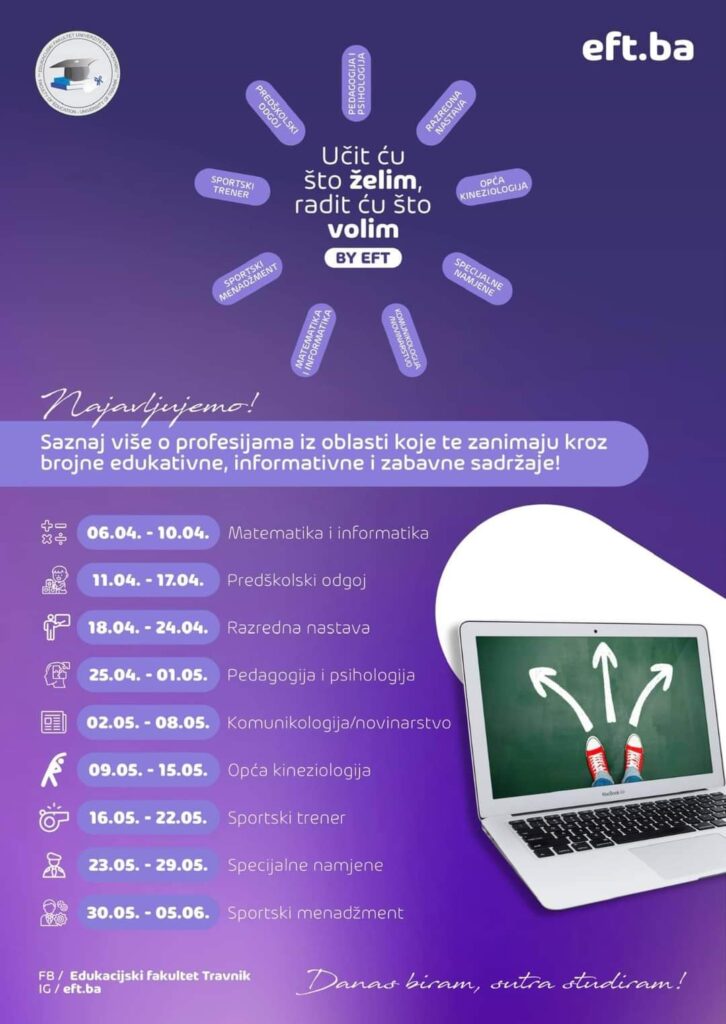 Odluka o izboru buduće profesije jedna je od najbitnijih u životu. Kroz aktivnosti koje će biti realizirane u narednom periodu želimo dati svoj doprinos u edukaciji i informisanju budićih studenata o određenim zanimanjima, te im na taj način olakšati odluku pri izboru studija!